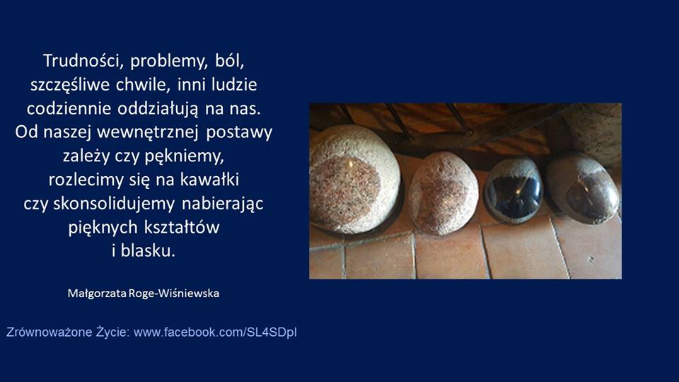 Trudności, problemy, ból, szczęśliwe chwile oddziałują na nas. Od naszej wewnętrznej postawy zależy czy pękniemy, rozlecimy się na kawałki czy skonsolidujemy nabierając pięknych kształtów i blasku. Dobrego dnia! Małgorzata...